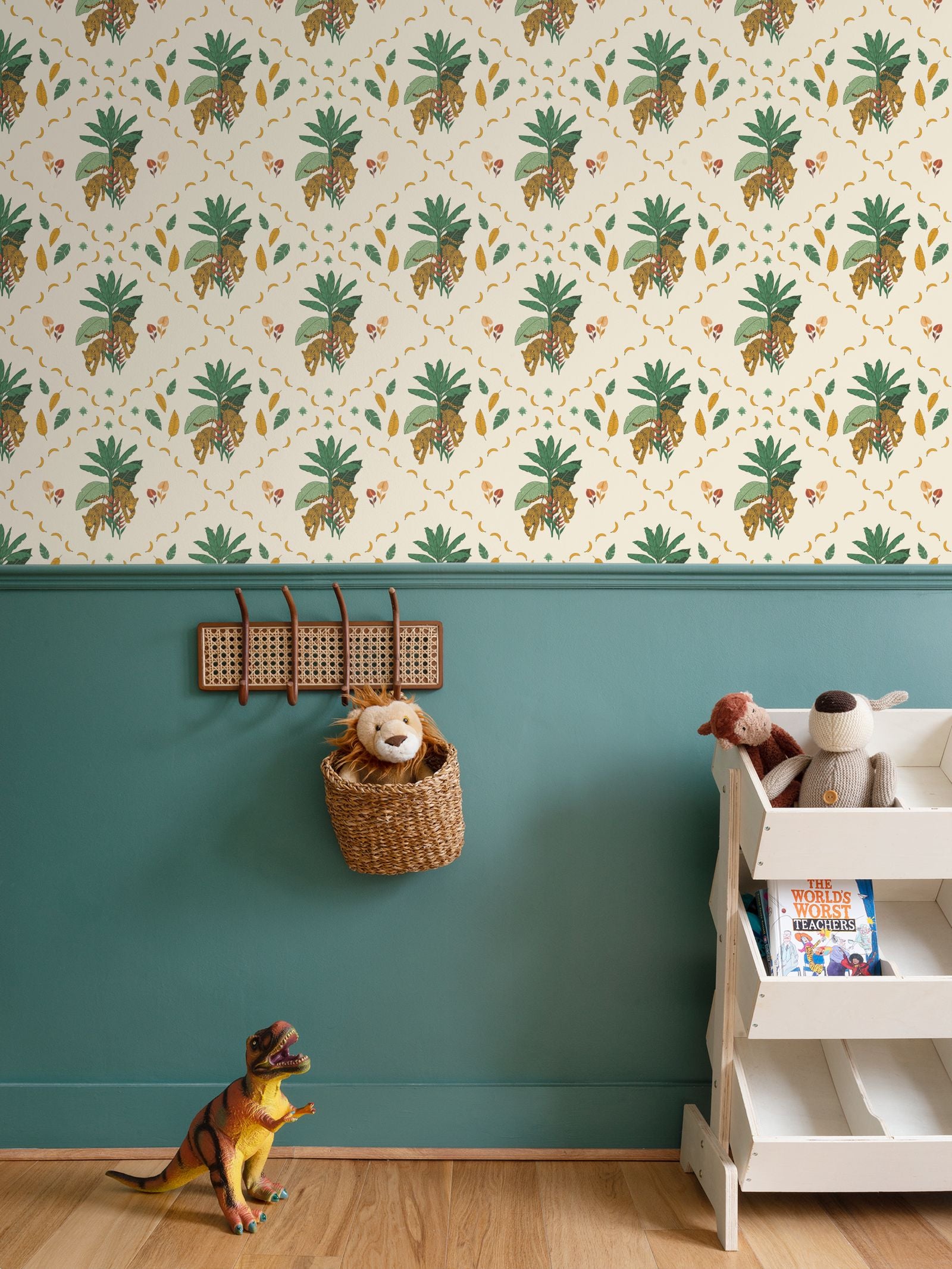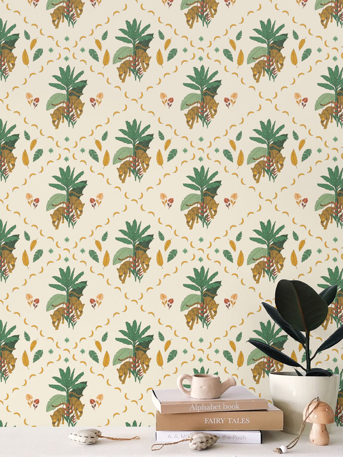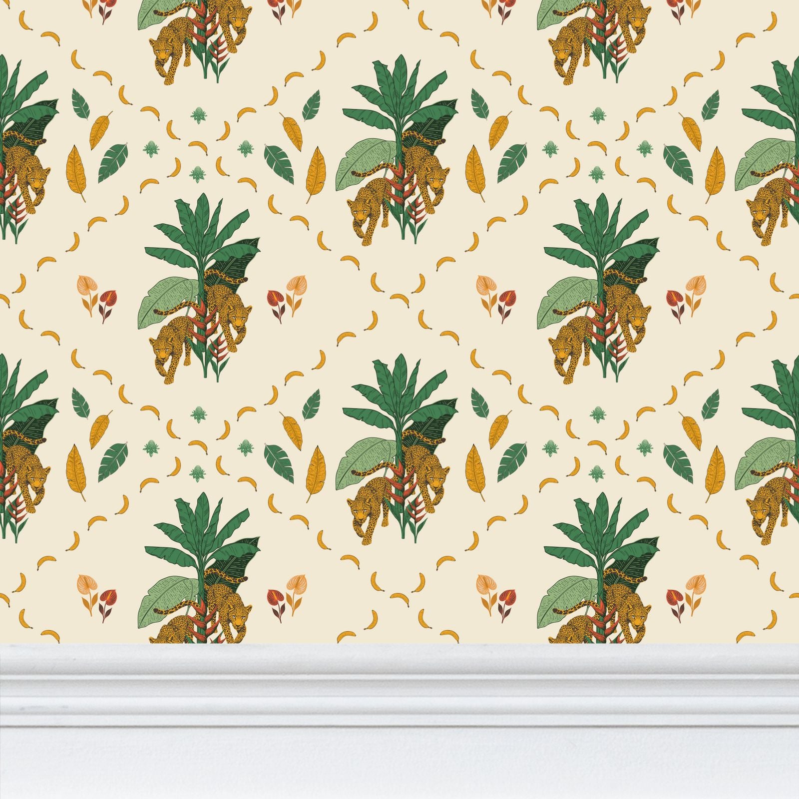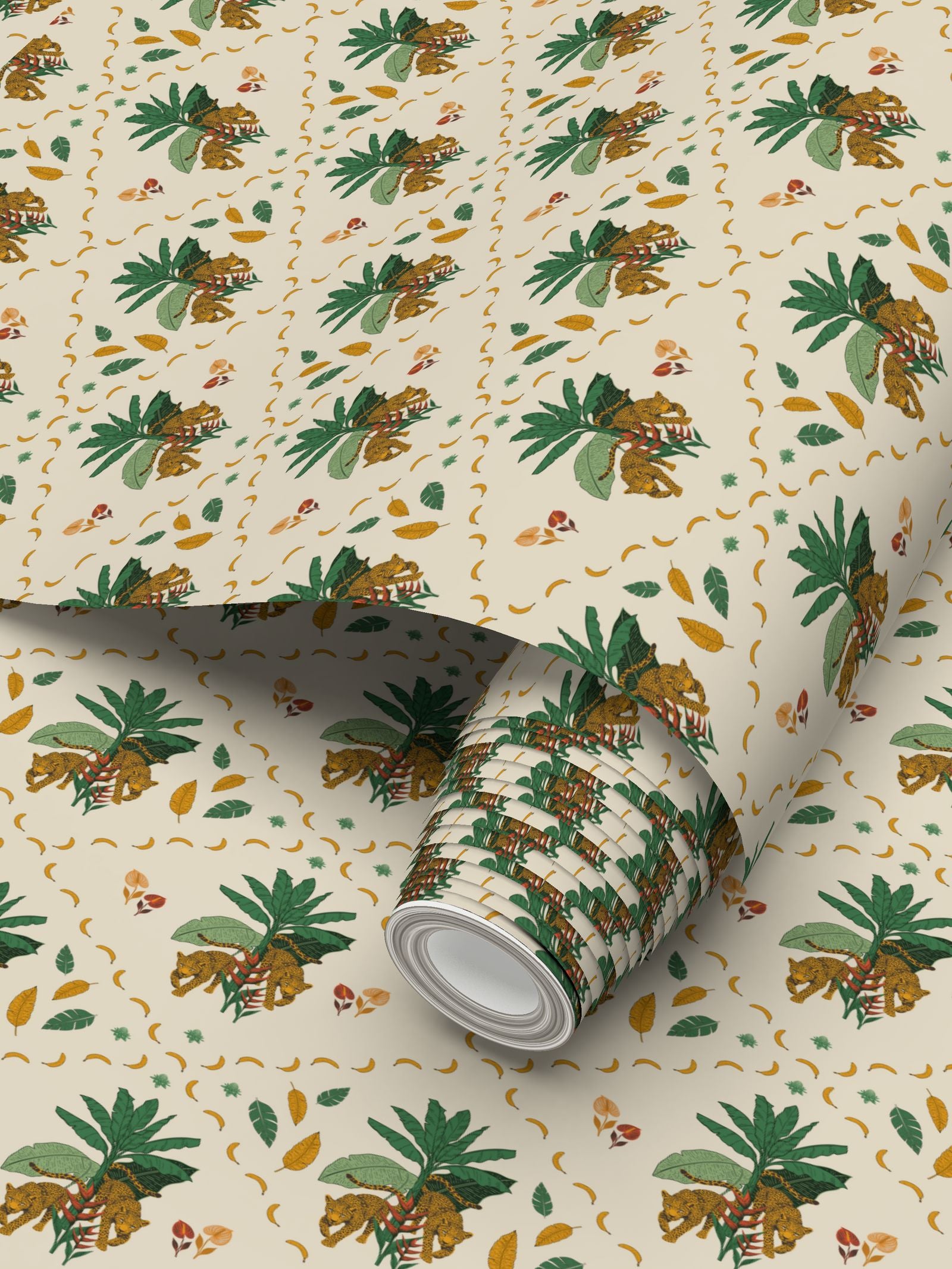 The leopards move through layered foliage, but the palette keeps everything grounded. Warm greens, ochre, and a soft neutral base give it depth without heaviness. There’s movement, but there’s also space to breathe.