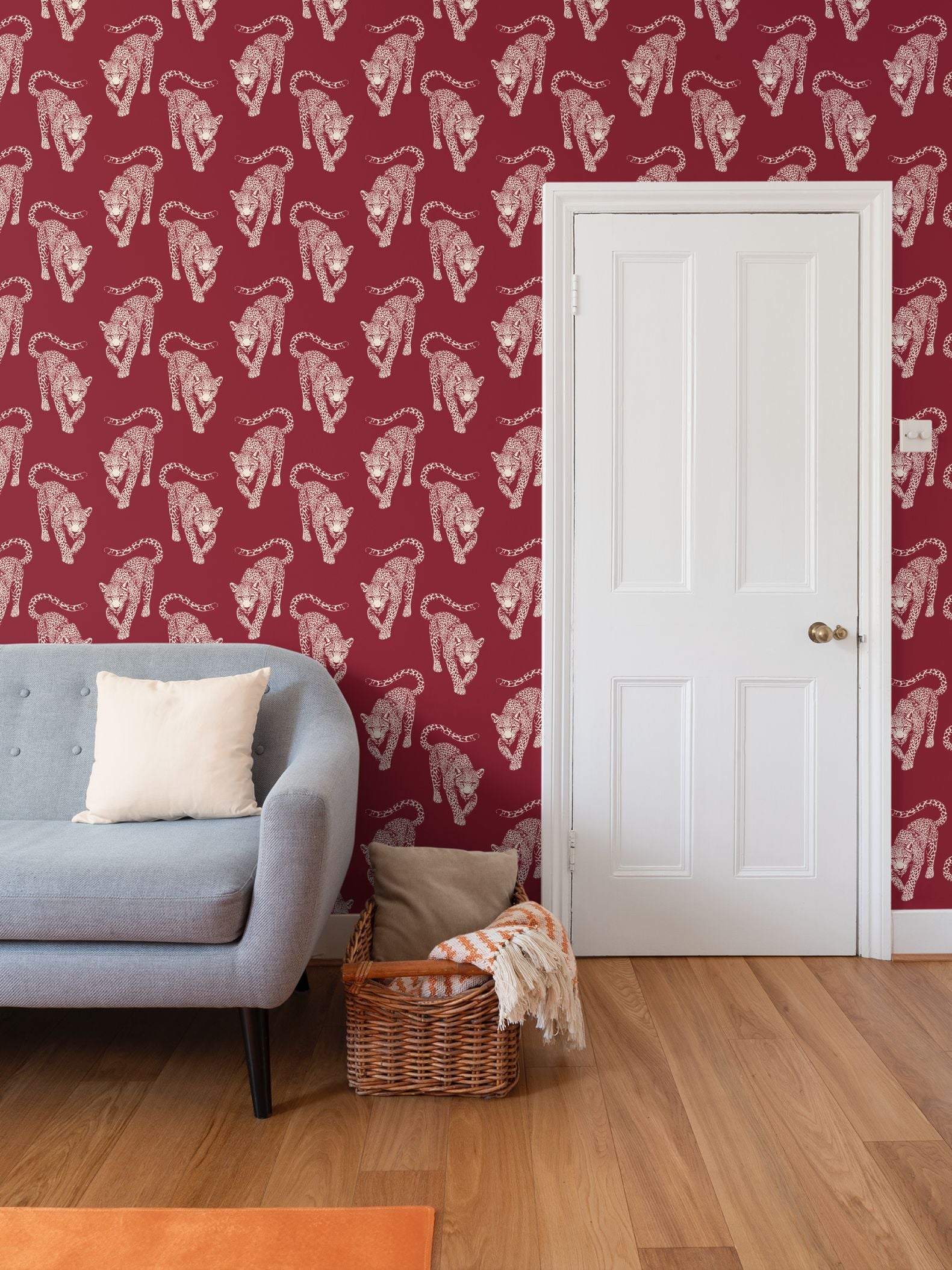 This colorway is about the power of restraint. I chose this raw, linen backdrop to act as a natural, breathable canvas, allowing the burgundy leopards to take center stage without overwhelming the room. It's a palette inspired by heritage materials—aged wine, sun-bleached flax, and hand-inked illustrations—designed for a space that feels both established and effortlessly modern.