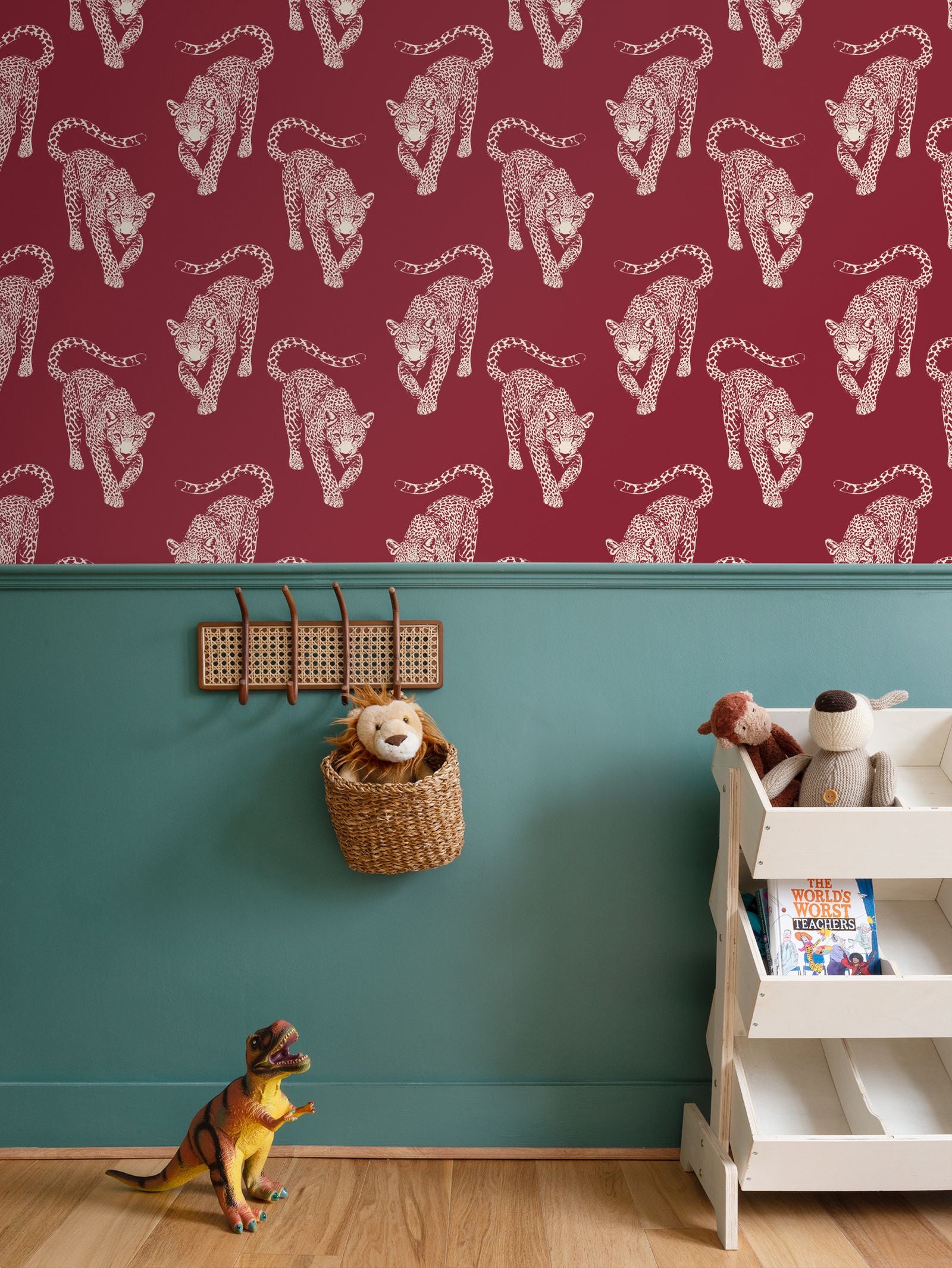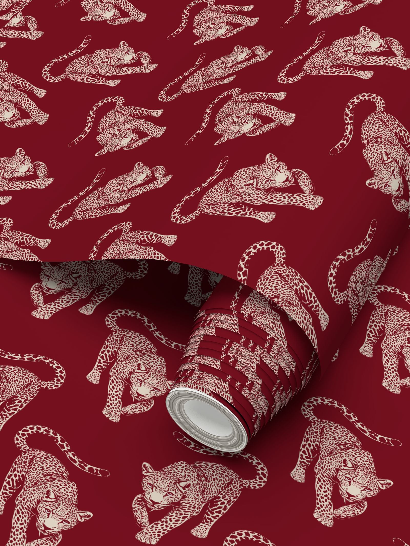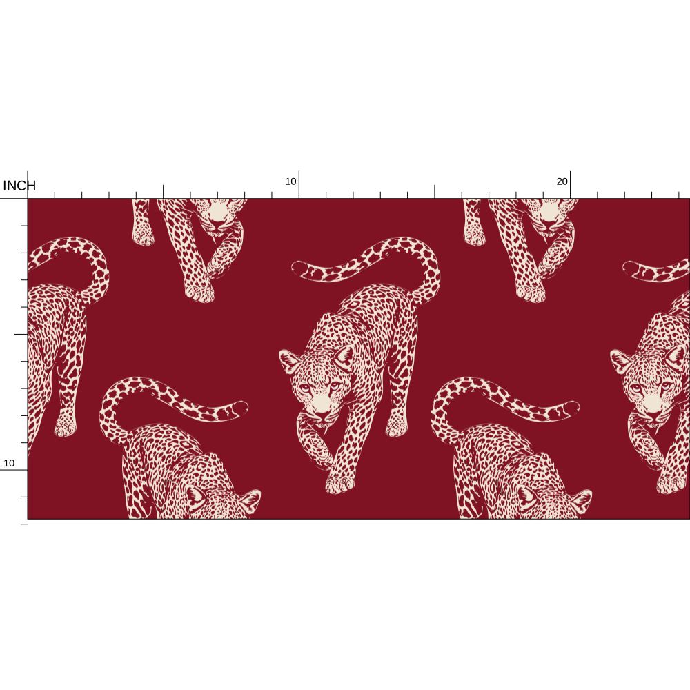 The leopards move across this organic texture in a deep, wine-red hue that carries a sense of permanence and refined taste.