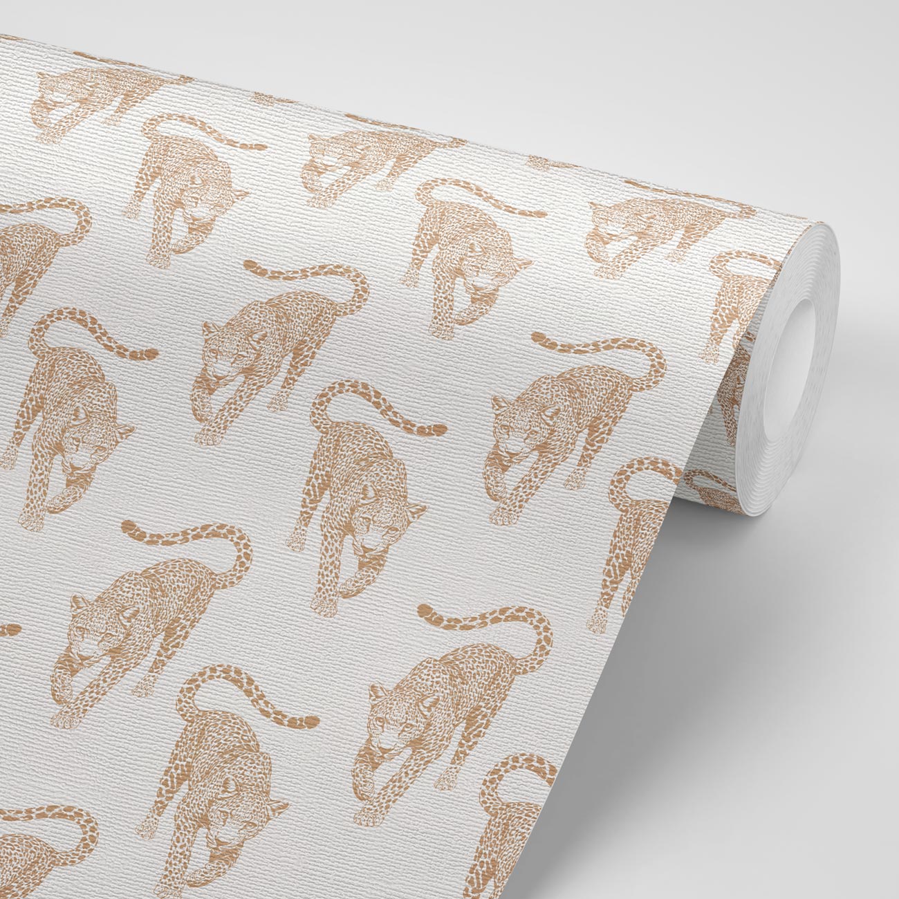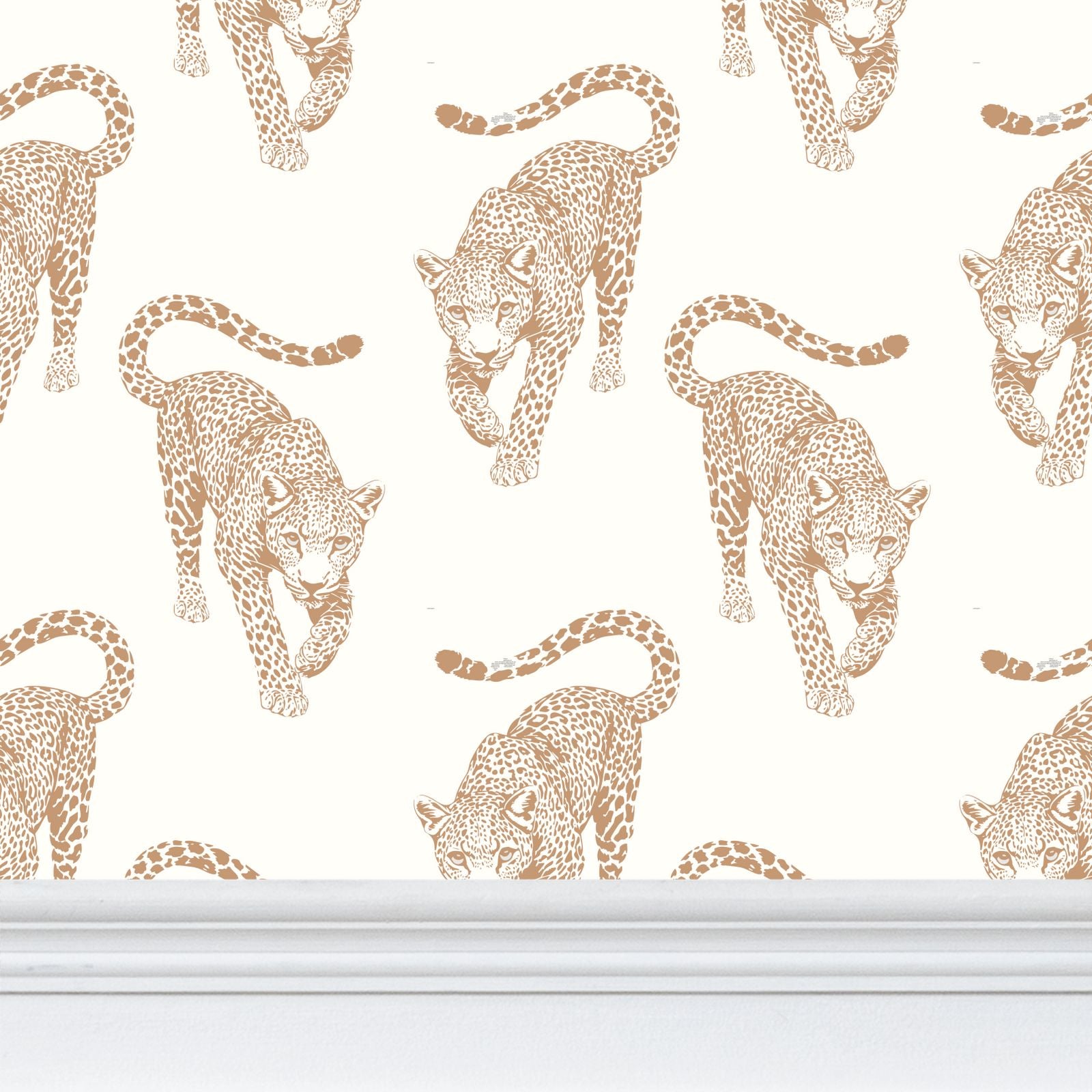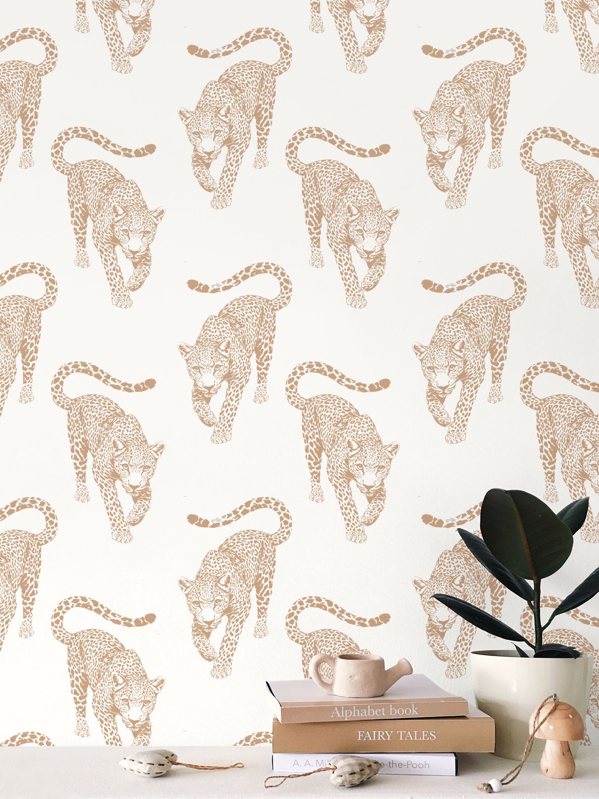 The leopards move across the wall in a soft, sun-bleached hue that perfectly matches the base, offering a subtle, tactile energy.