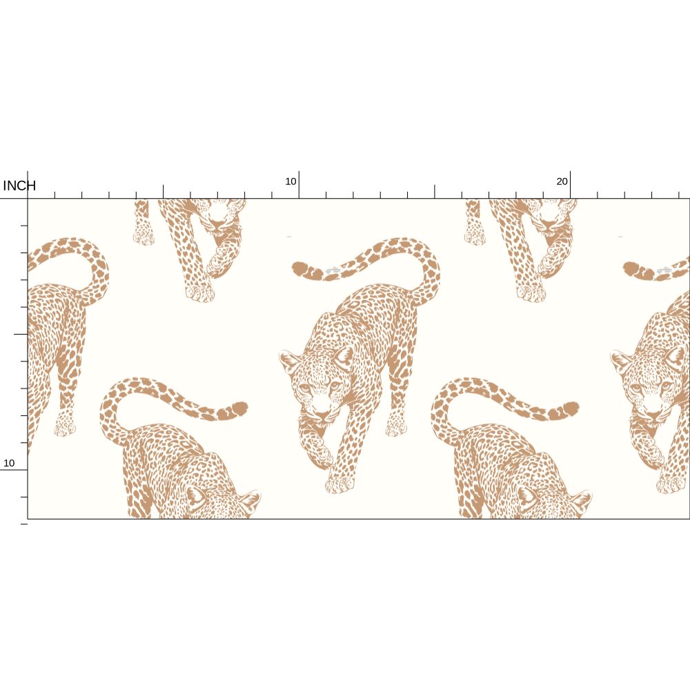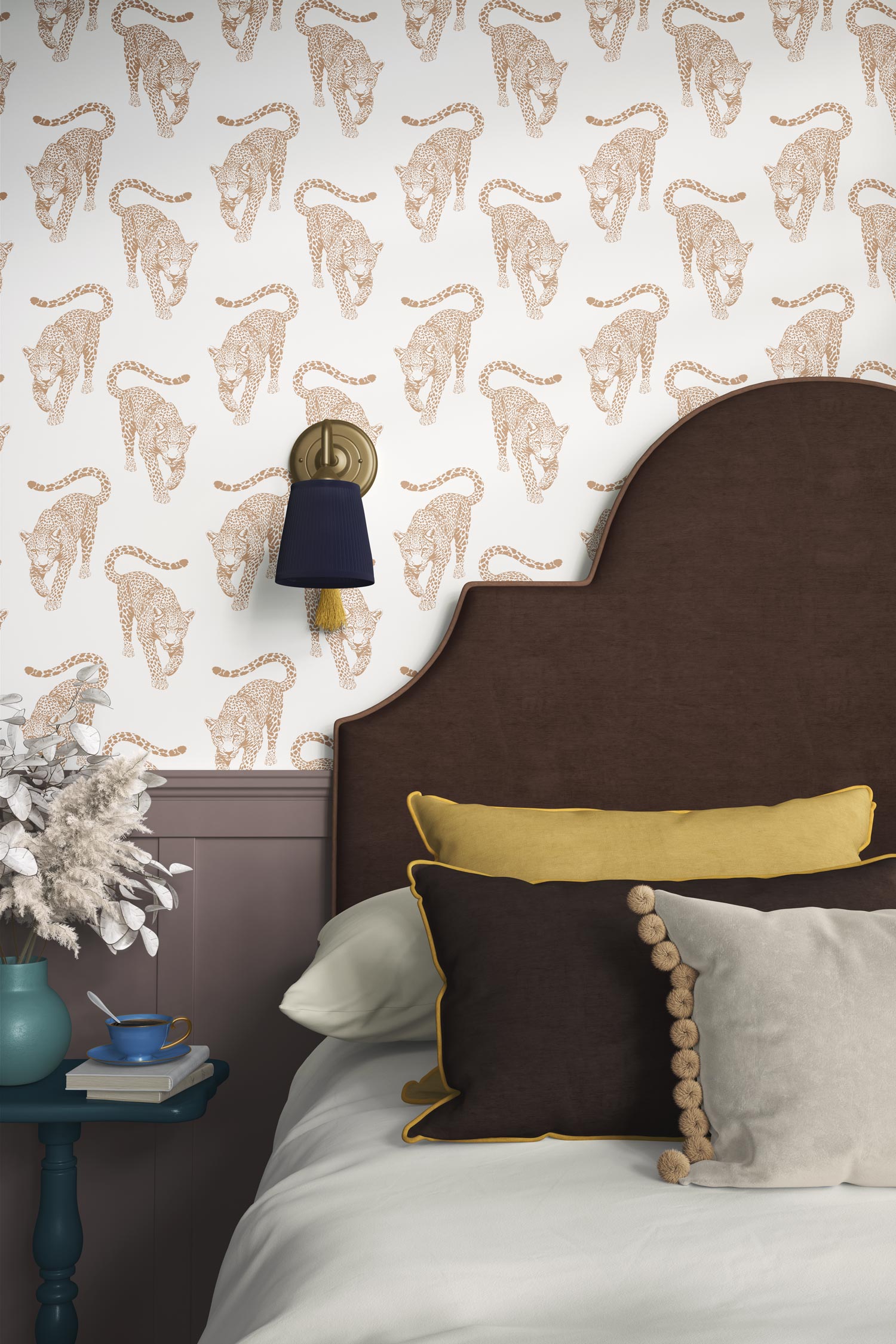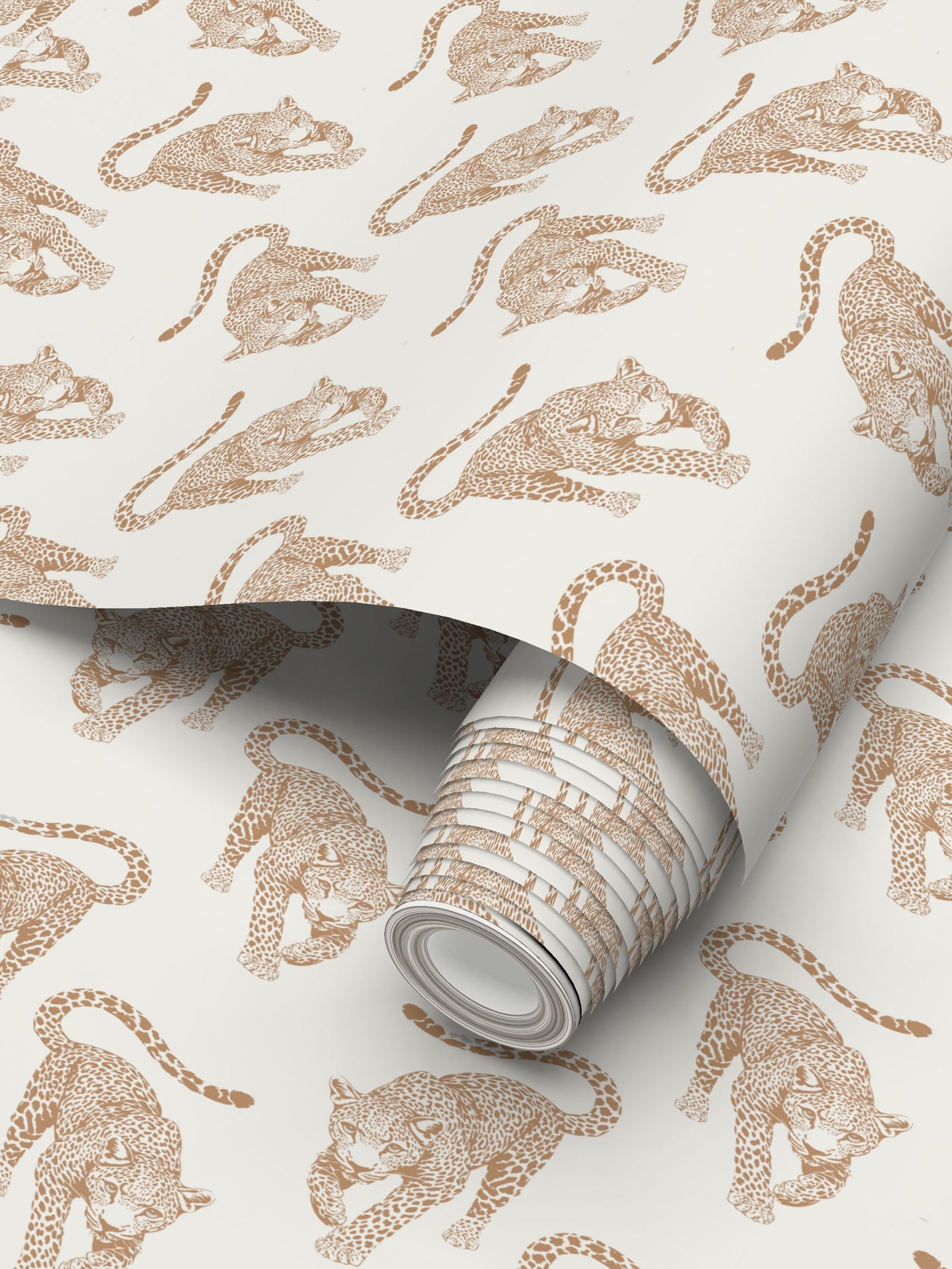 The leopards move across the wall in a soft, sun-bleached hue that perfectly matches the base, offering a subtle, tactile energy.