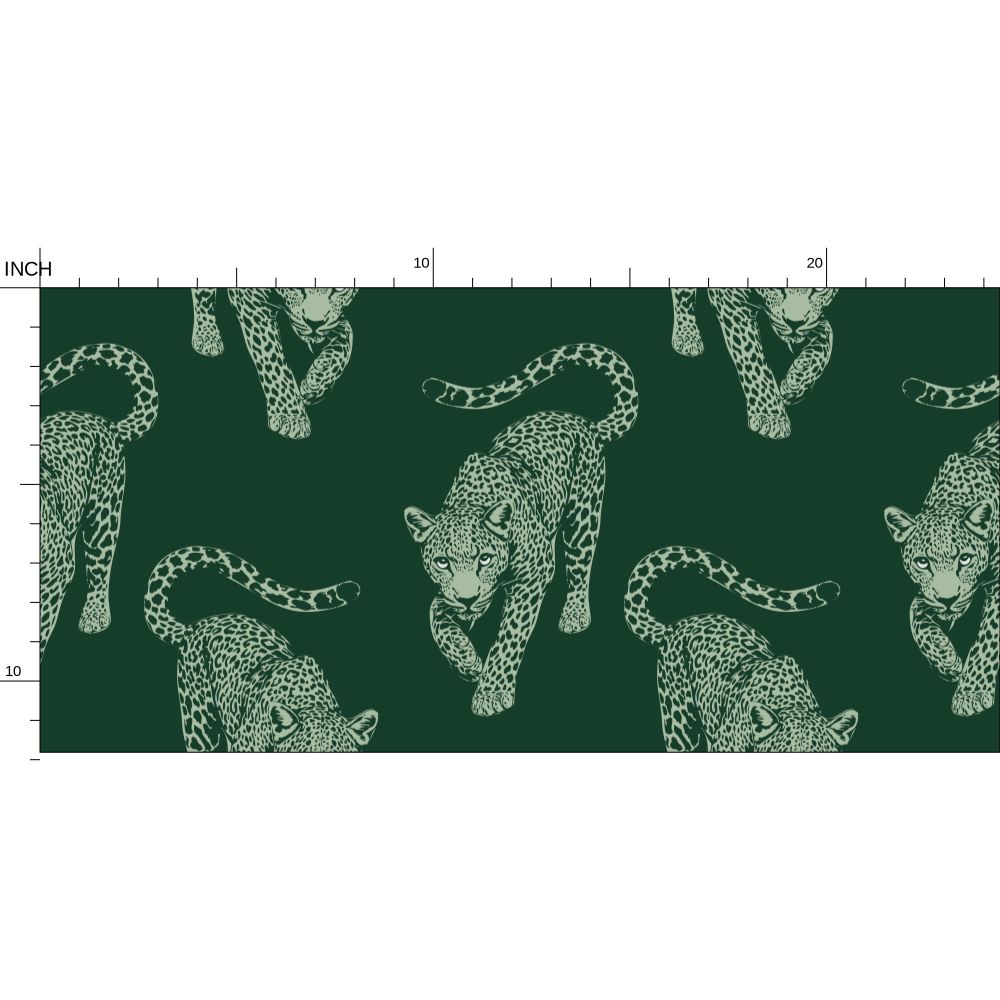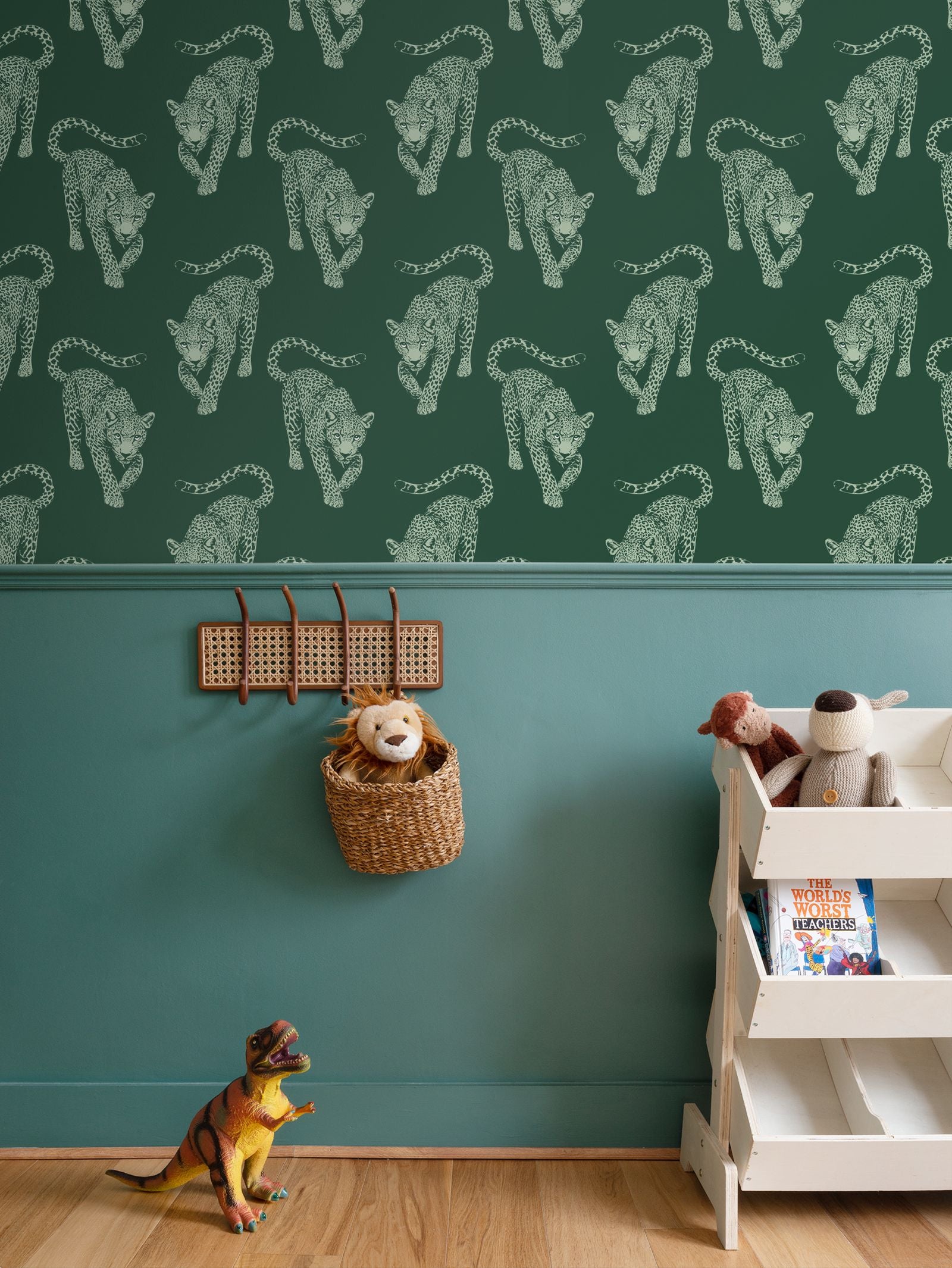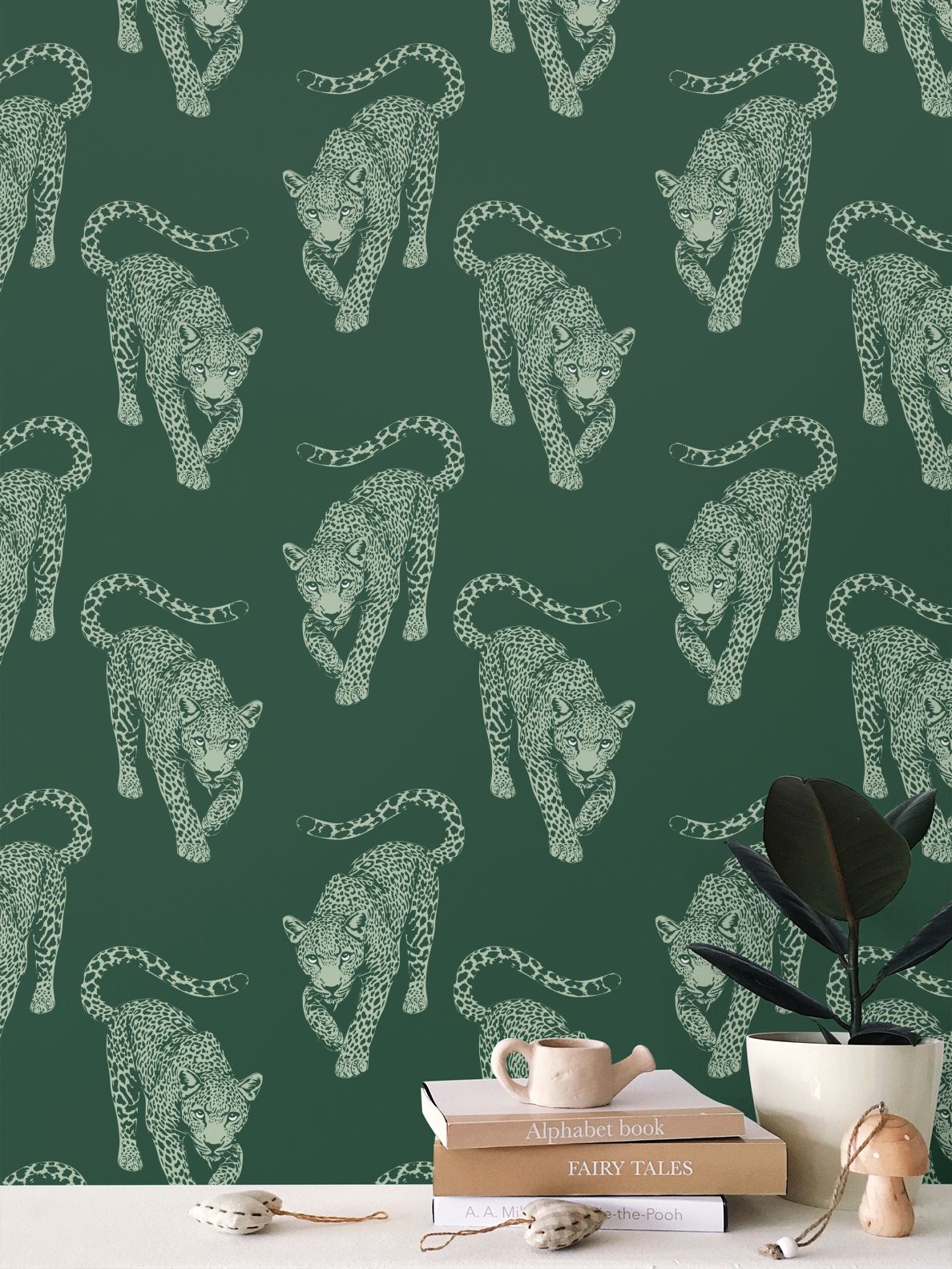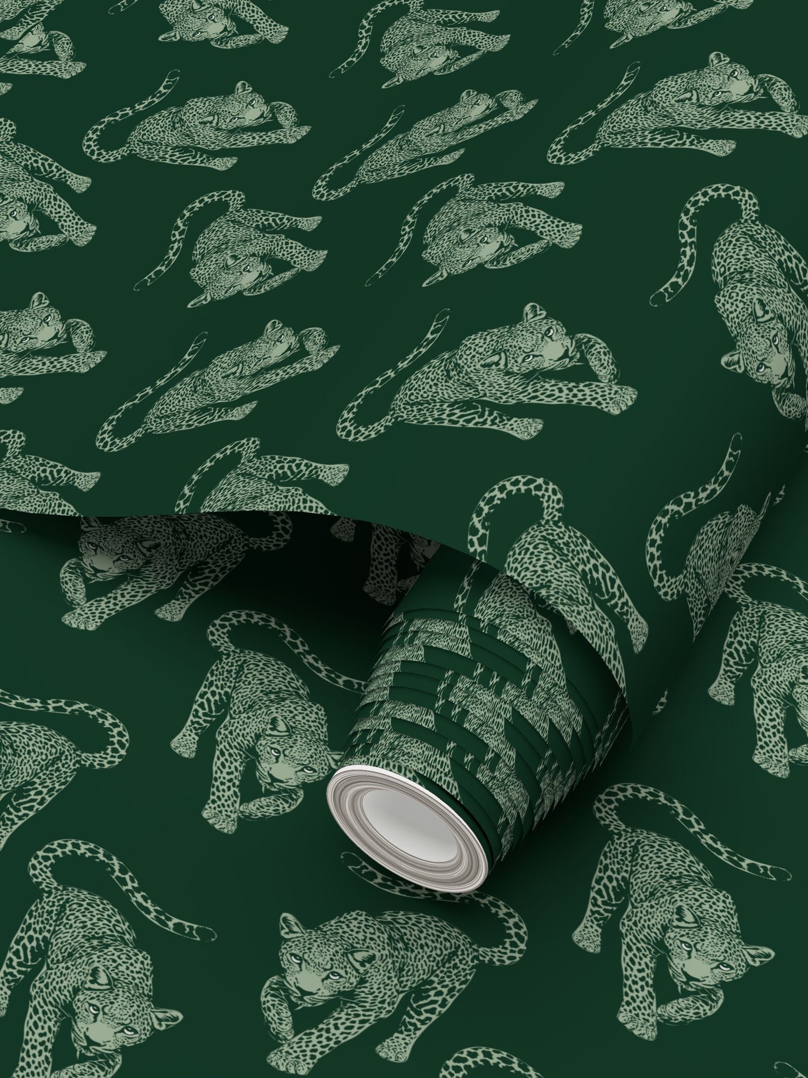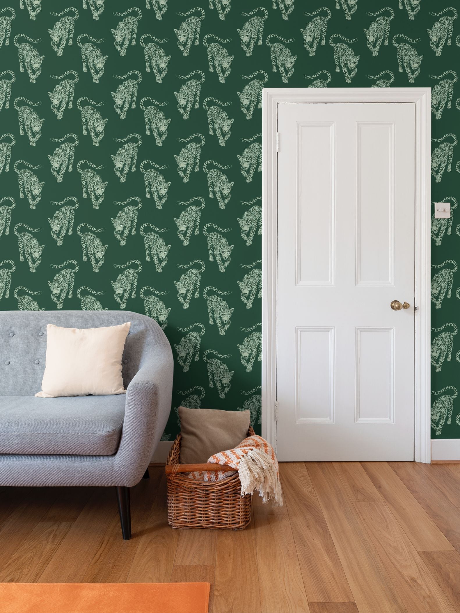 The leopards emerge from the shadows in a tone-on-tone dance of emerald and forest greens, creating a mural that feels sophisticated rather than loud.
