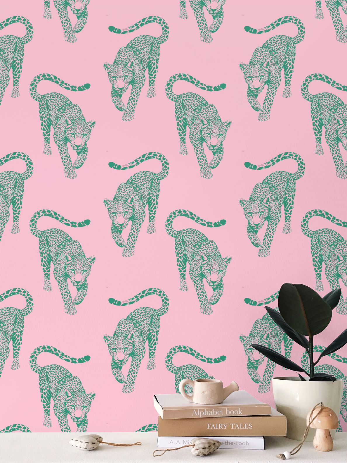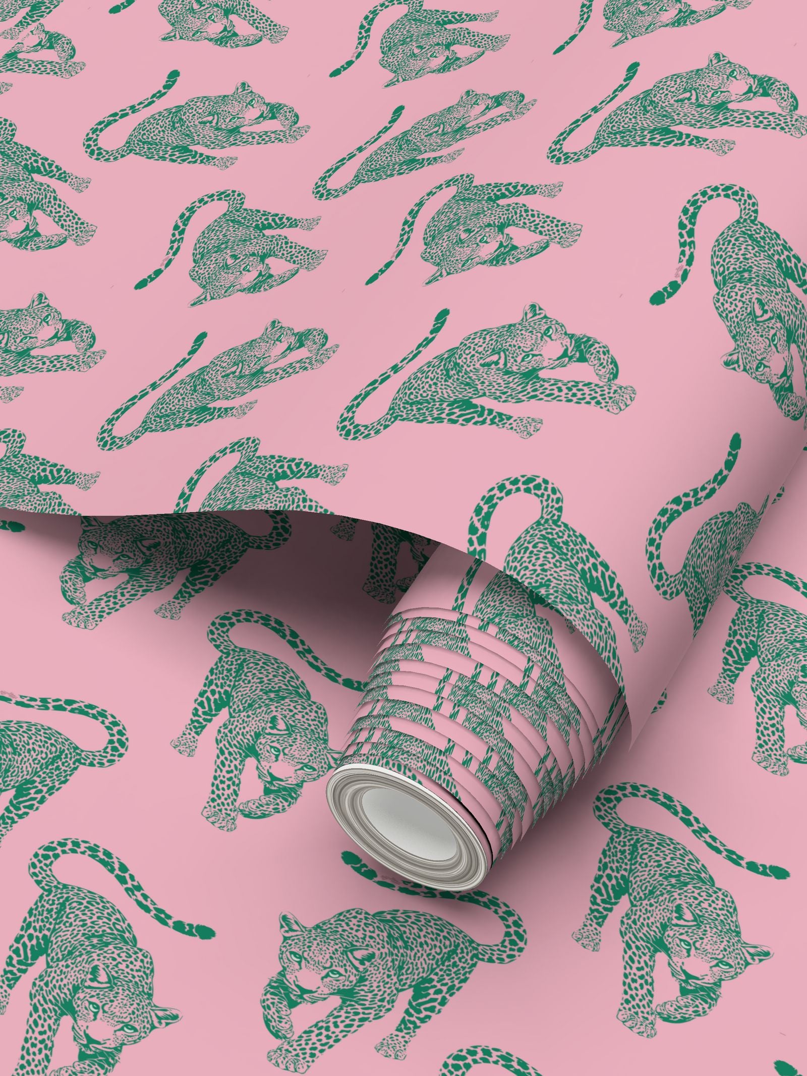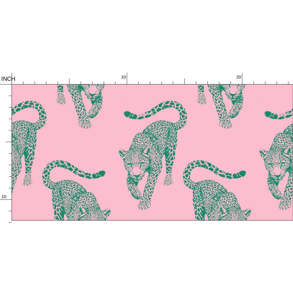 The leopards march across a warm, flamingo-pink field in sharp teal ink, creating a visual rhythm that feels like a vintage postcard brought to life in high-definition.