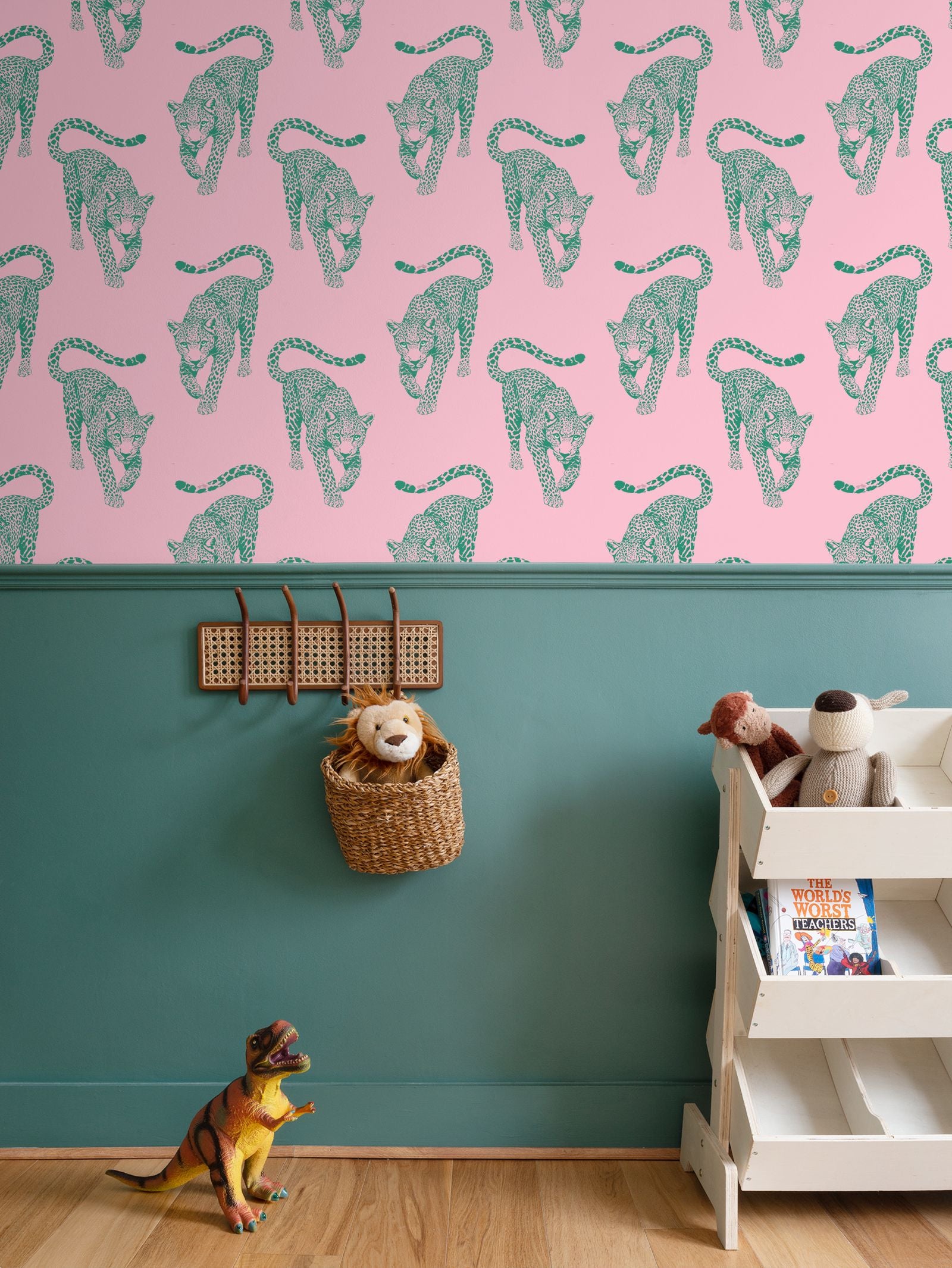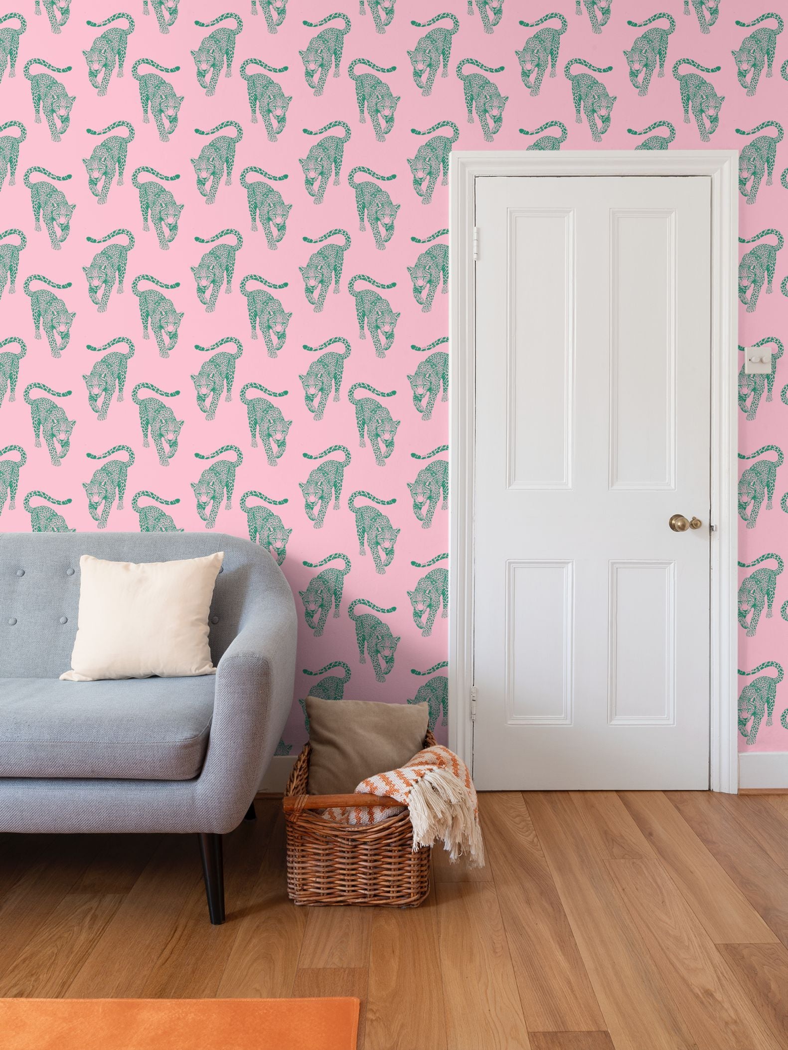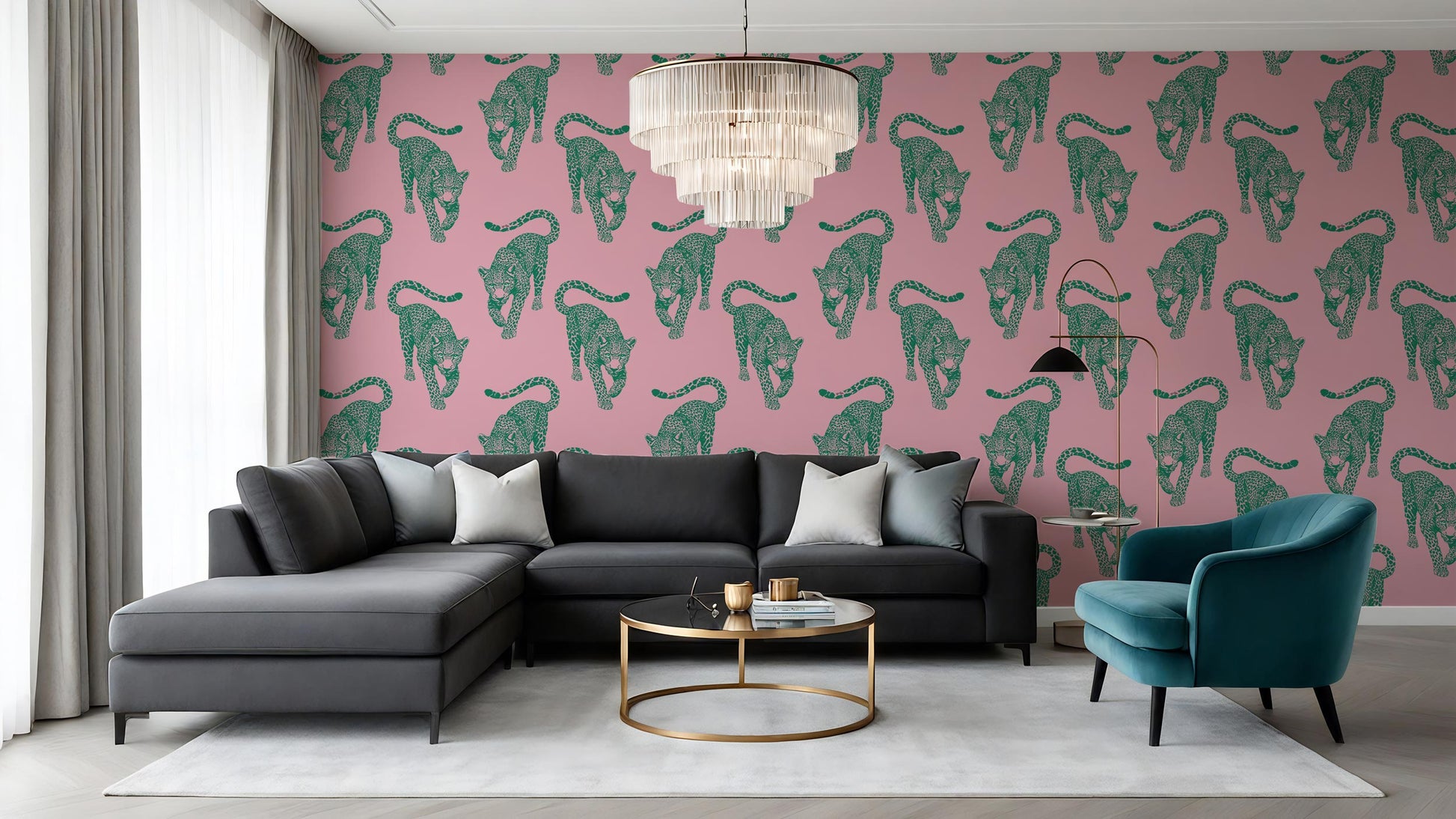 The leopards march across a warm, flamingo-pink field in sharp teal ink, creating a visual rhythm that feels like a vintage postcard brought to life in high-definition.