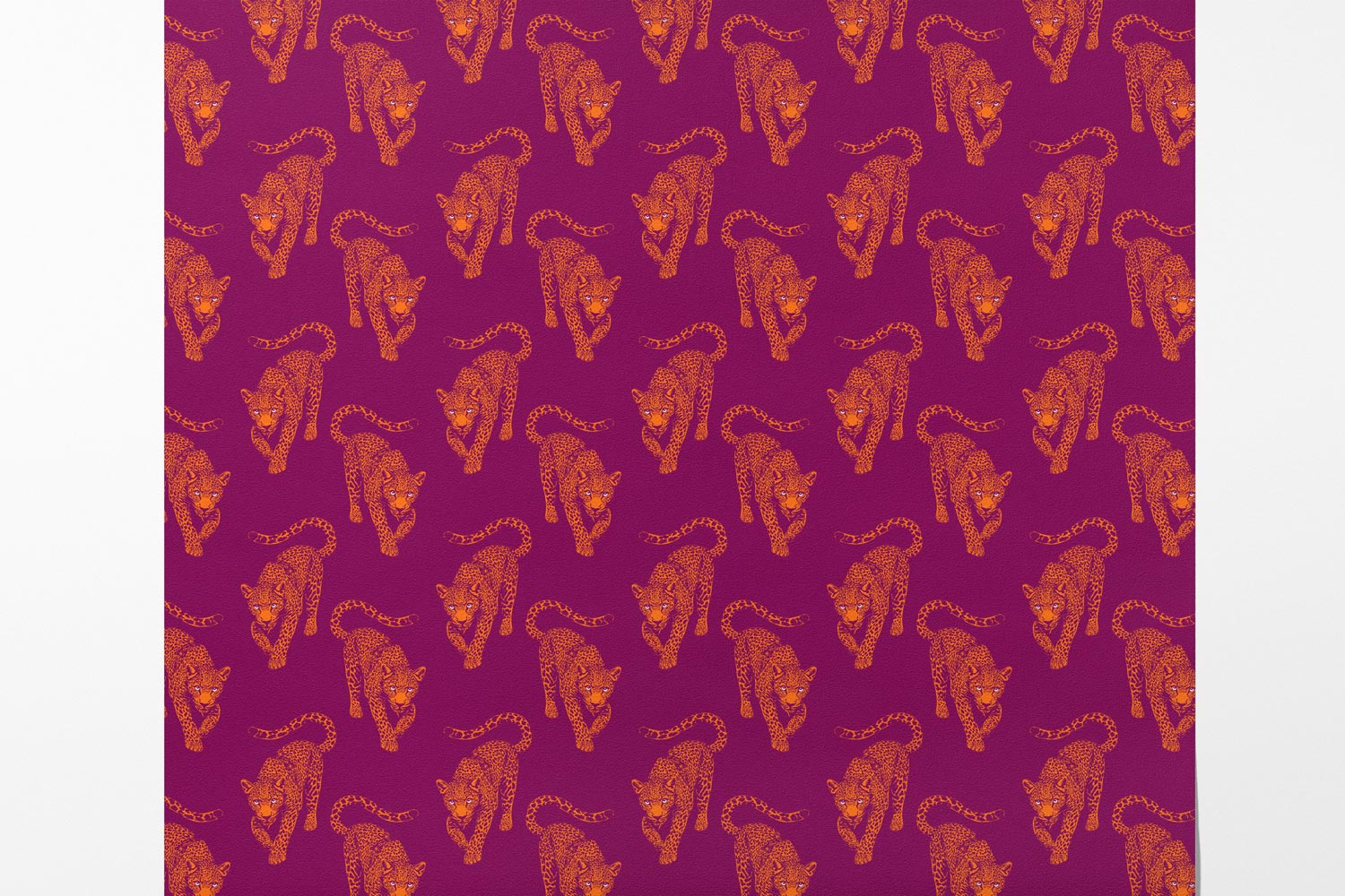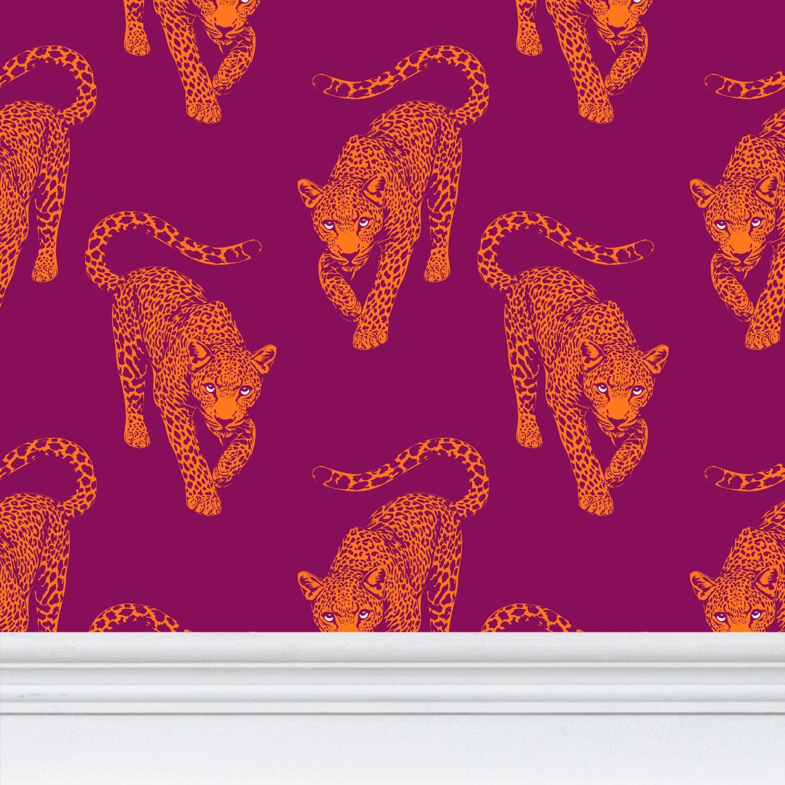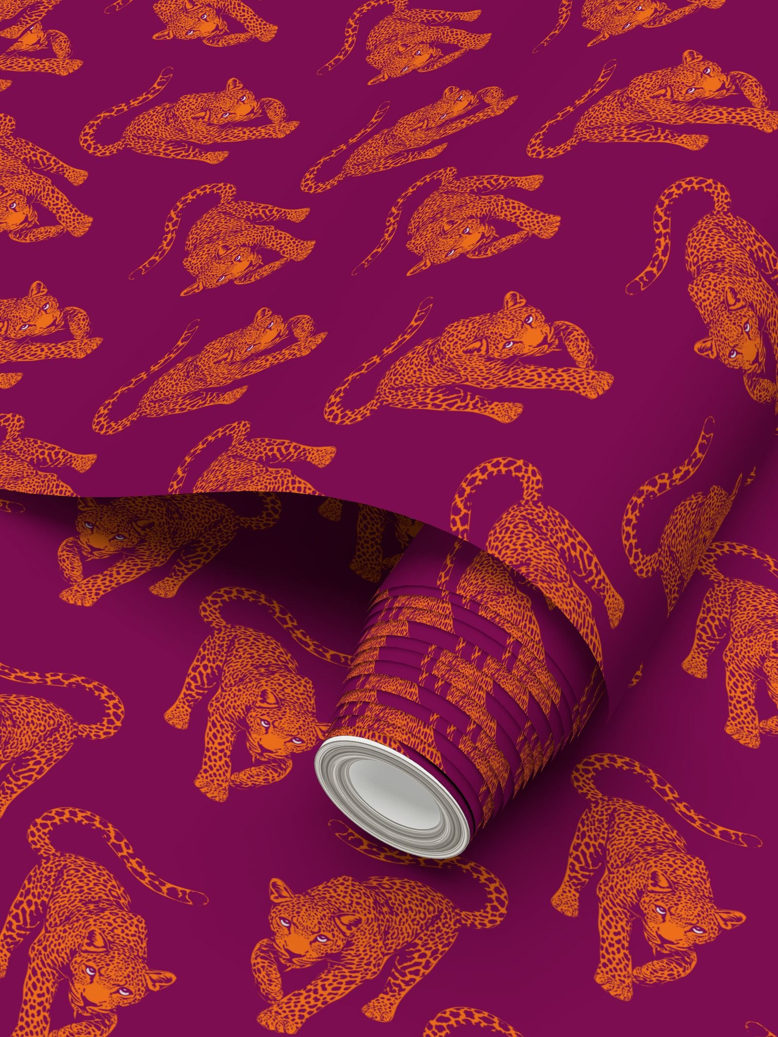 The leopards march across a deep, electric magenta field in bright, citrus-orange ink. This color clash creates a visual hum, a "Pop Night" energy that transforms any room into a high-fashion statement.