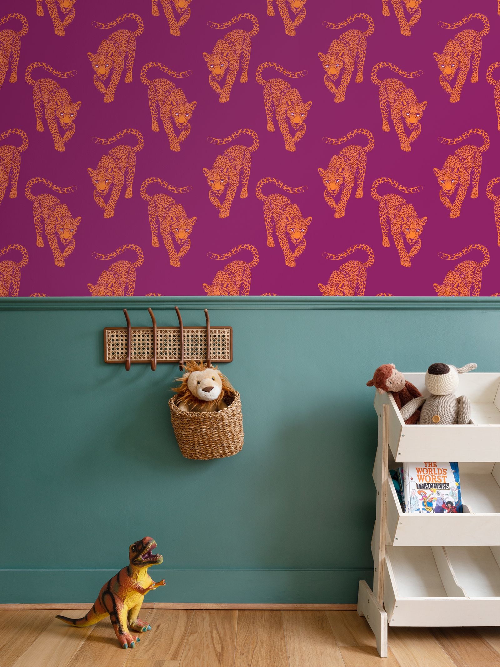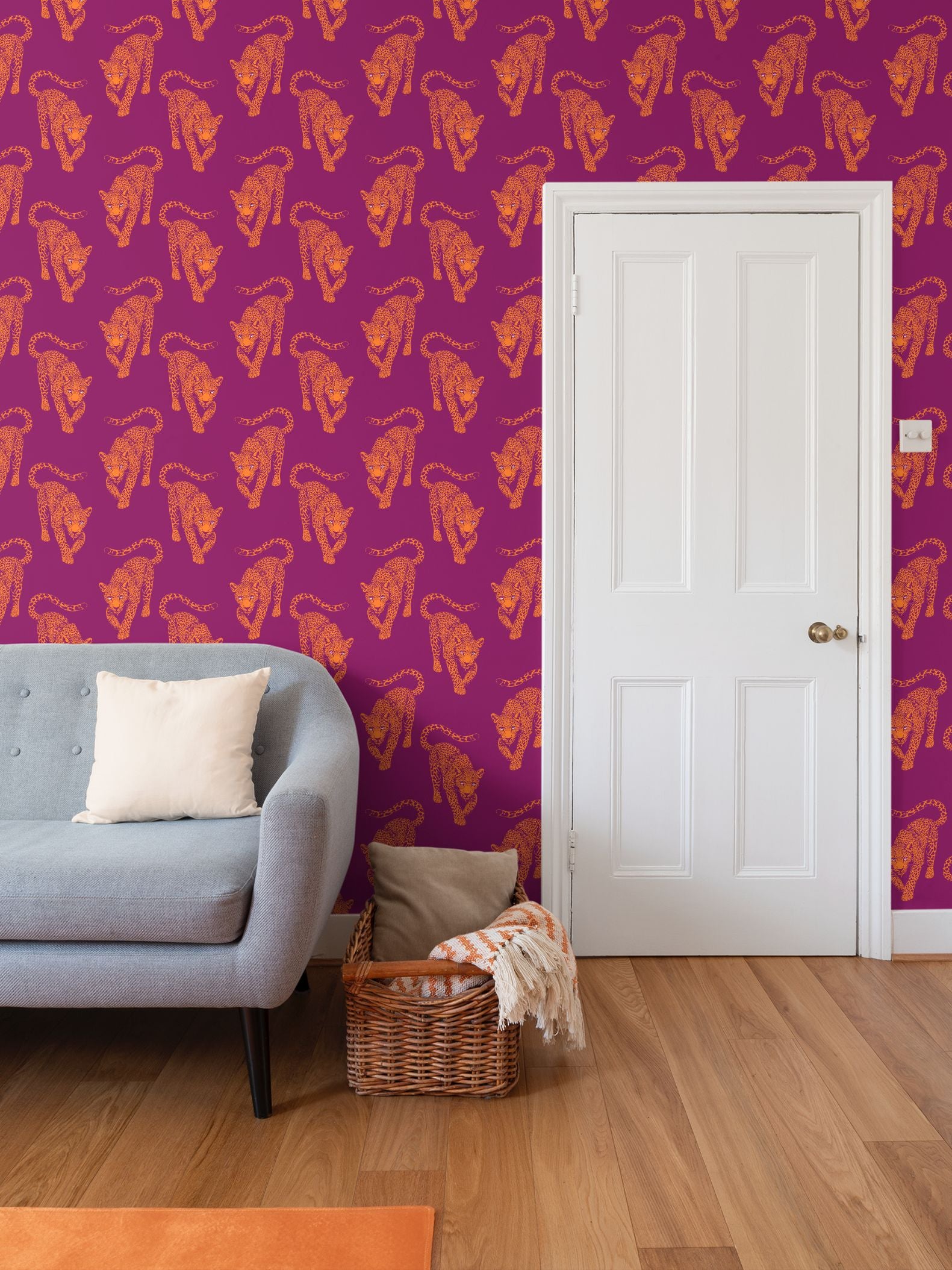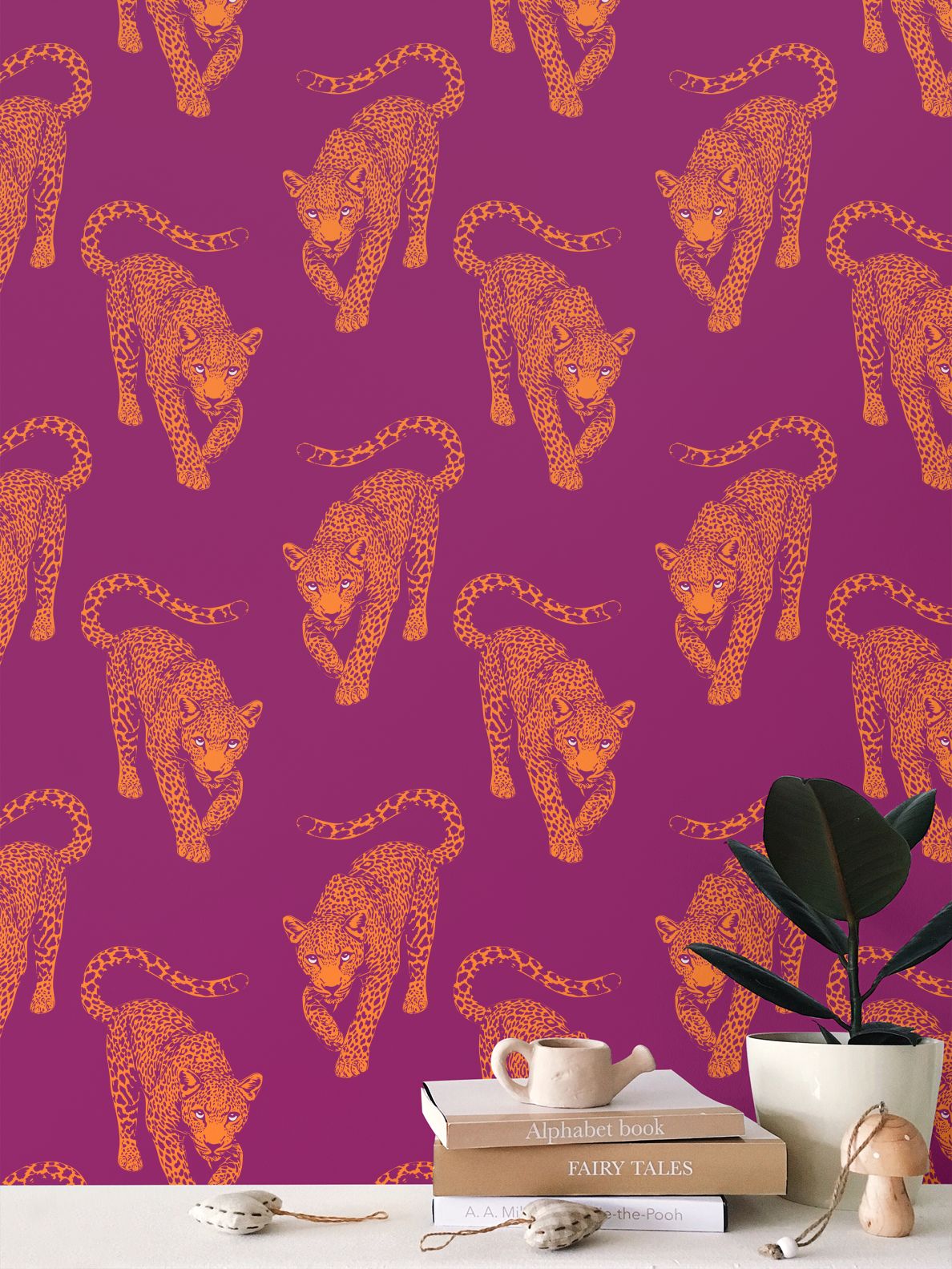 The leopards march across a deep, electric magenta field in bright, citrus-orange ink. This color clash creates a visual hum, a "Pop Night" energy that transforms any room into a high-fashion statement.