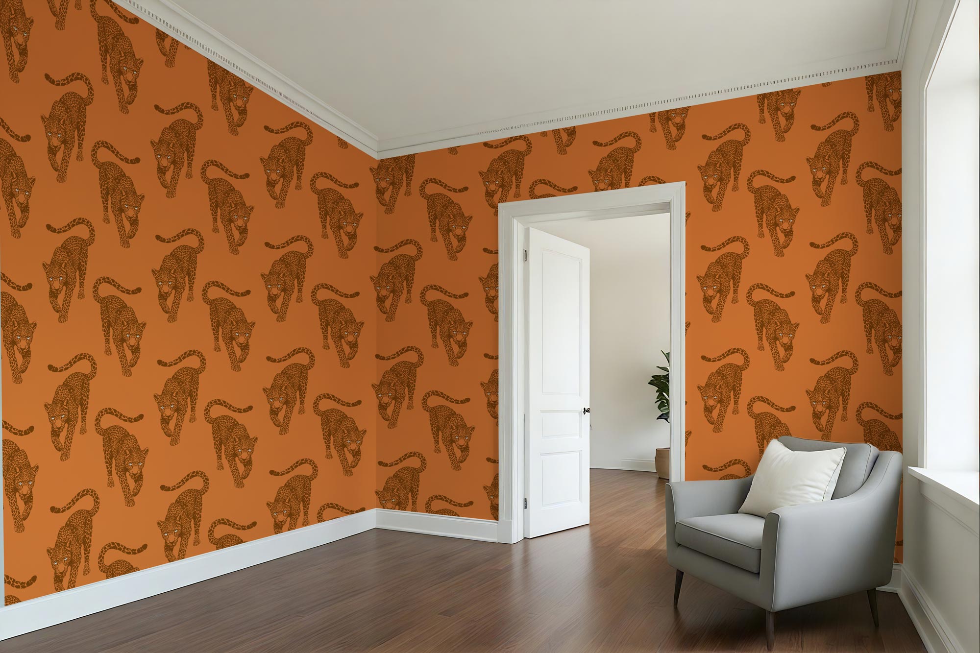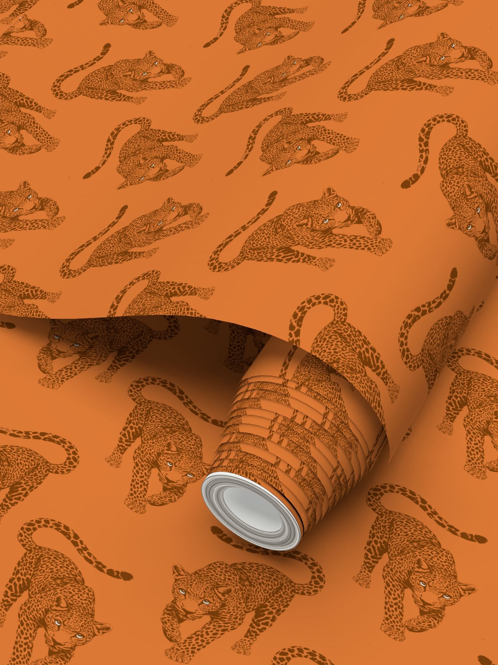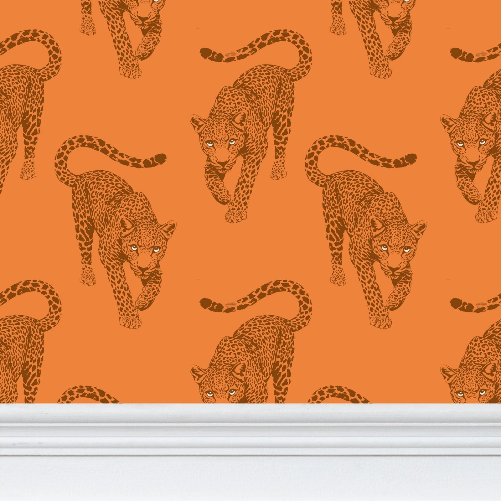 The leopards march across a rich, terracotta-clay field in deep, burnt-umber ink. This monochromatic layering gives the mural a sophisticated, toasted glow that feels incredibly chic in a room filled with natural wood, brass, and leather.