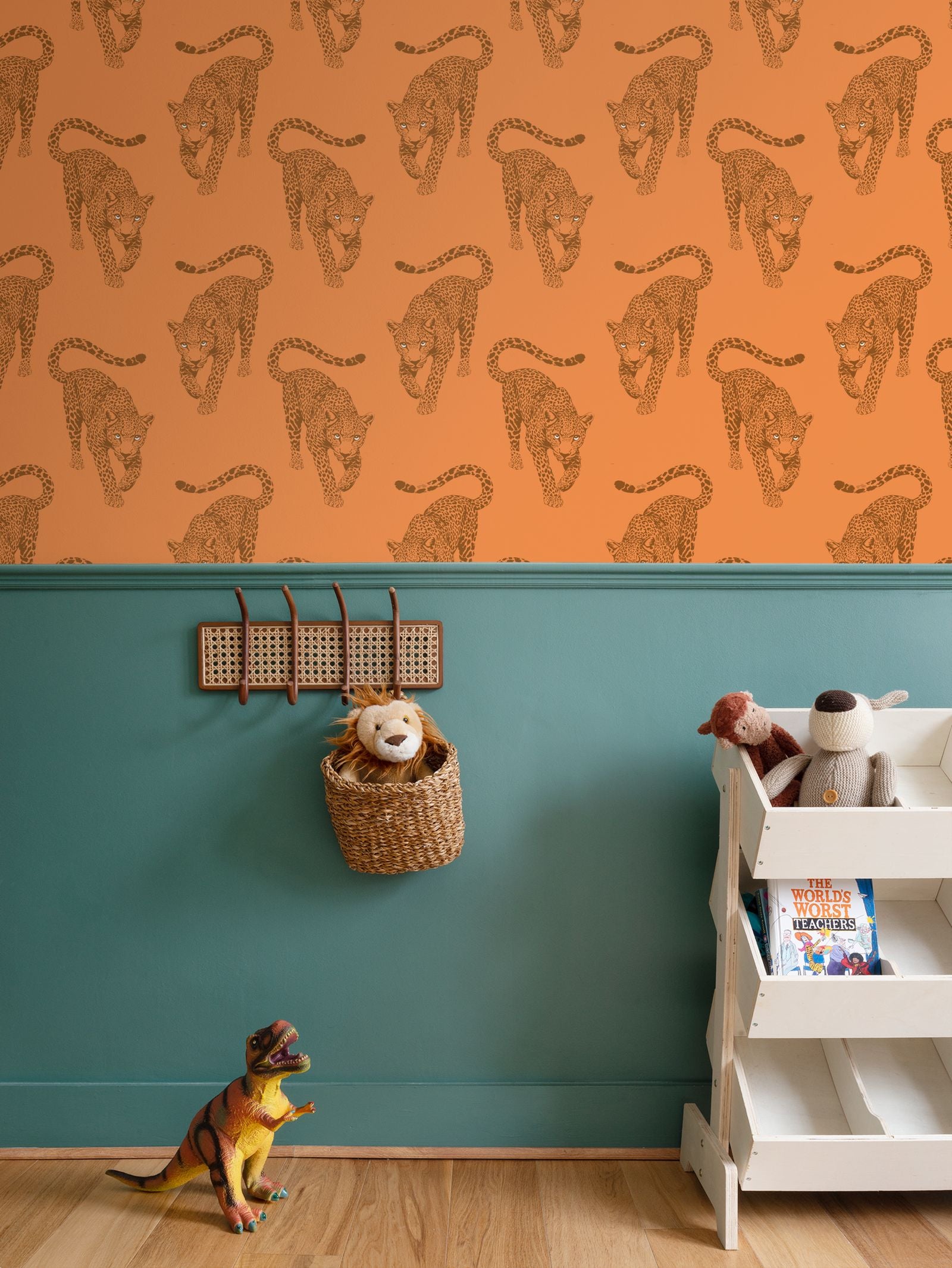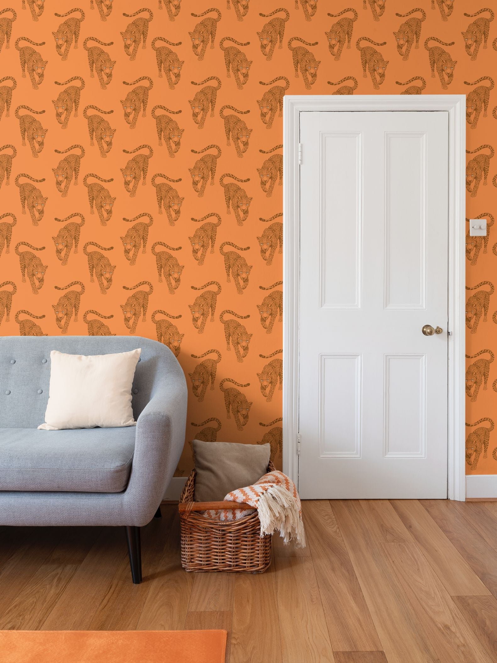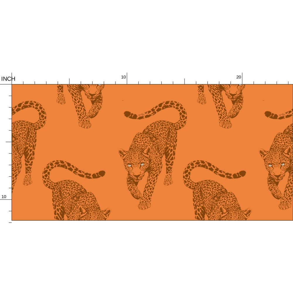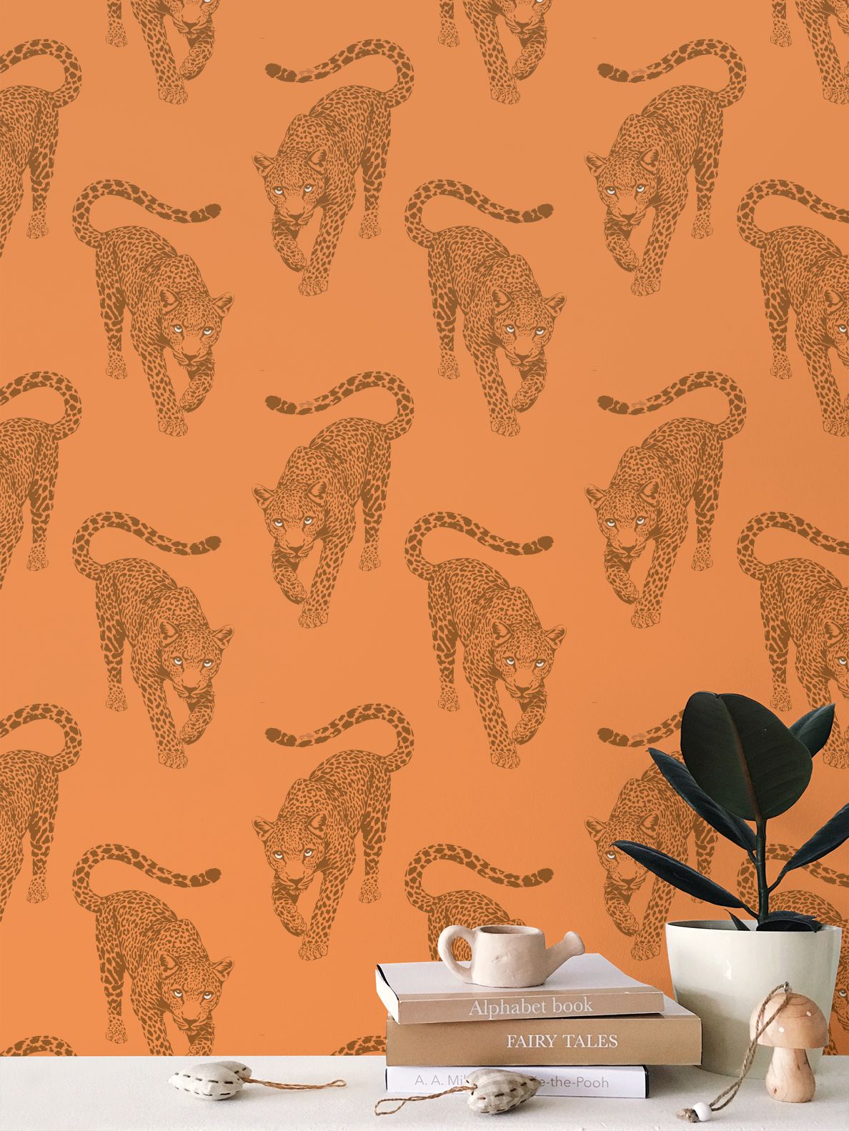 The leopards march across a rich, terracotta-clay field in deep, burnt-umber ink. This monochromatic layering gives the mural a sophisticated, toasted glow that feels incredibly chic in a room filled with natural wood, brass, and leather.